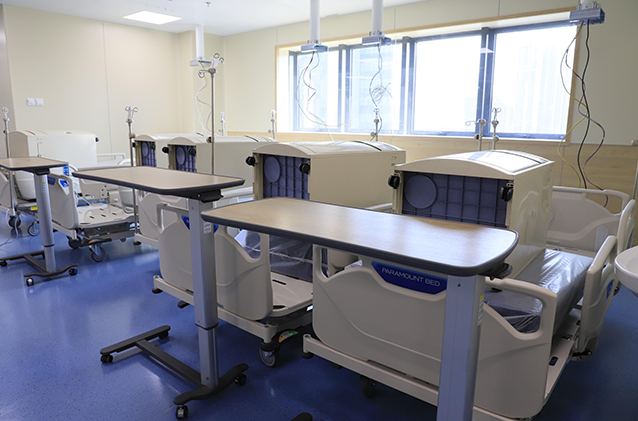其分布为:地上一层为门诊大厅、便民服务中心及药房等。二层为结核门诊,三层为内镜中心,四层为检验科,五层为手术室,六层为多学科会诊及设备机房,七层为ICU,八层为血透区。九~二十层为普通住院病房,二十一层与二十二层为负压病房,二十一层与二十二层中间有设备夹层。地下一层为放射科、生物样本库、设备房,地下二层~地下四层为设备机房及停车库。