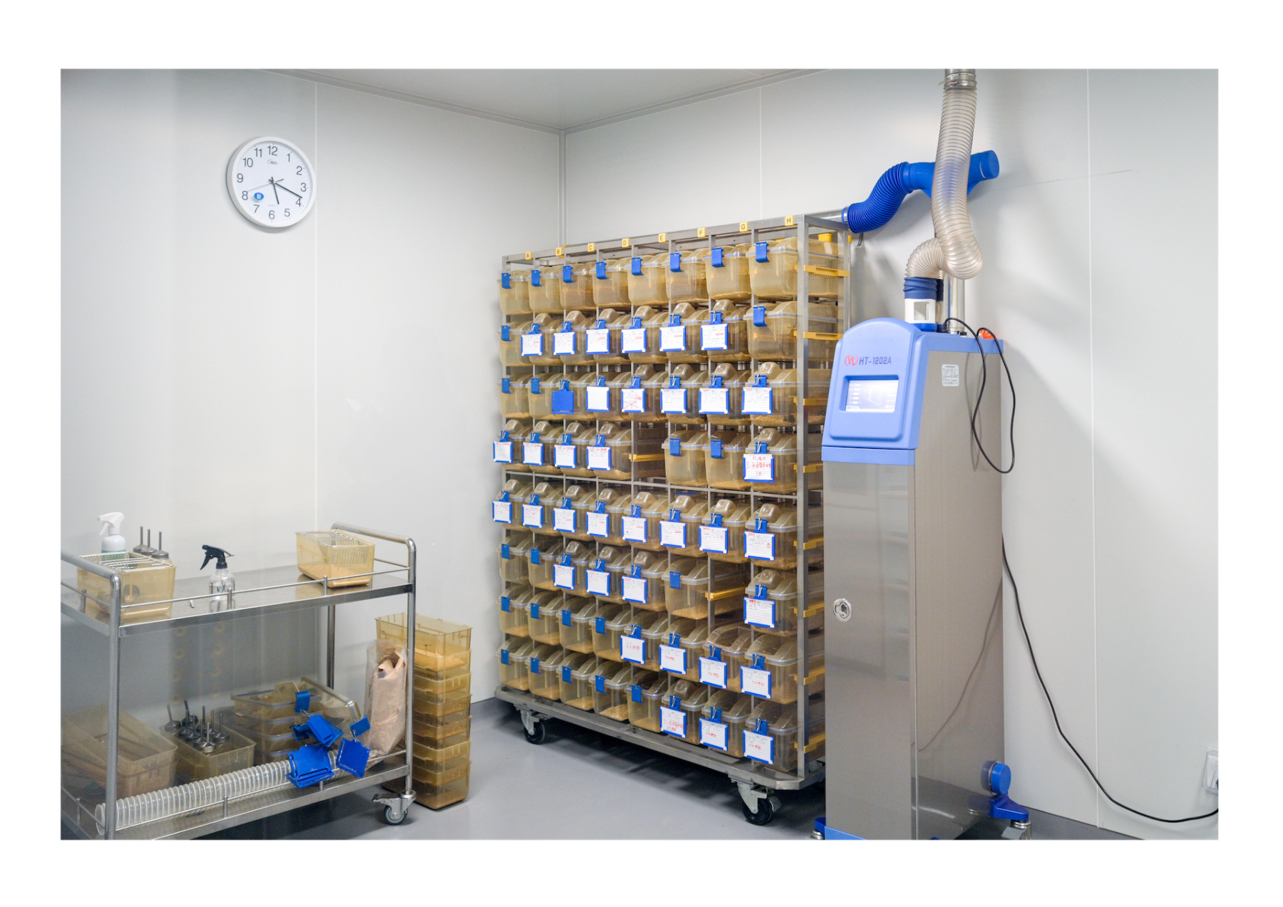 生产区采用大开间,提高饲养密度。实验区采用小开间布局,不同种类的动物和实验可以在独立的小屏障区进行。